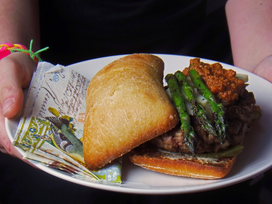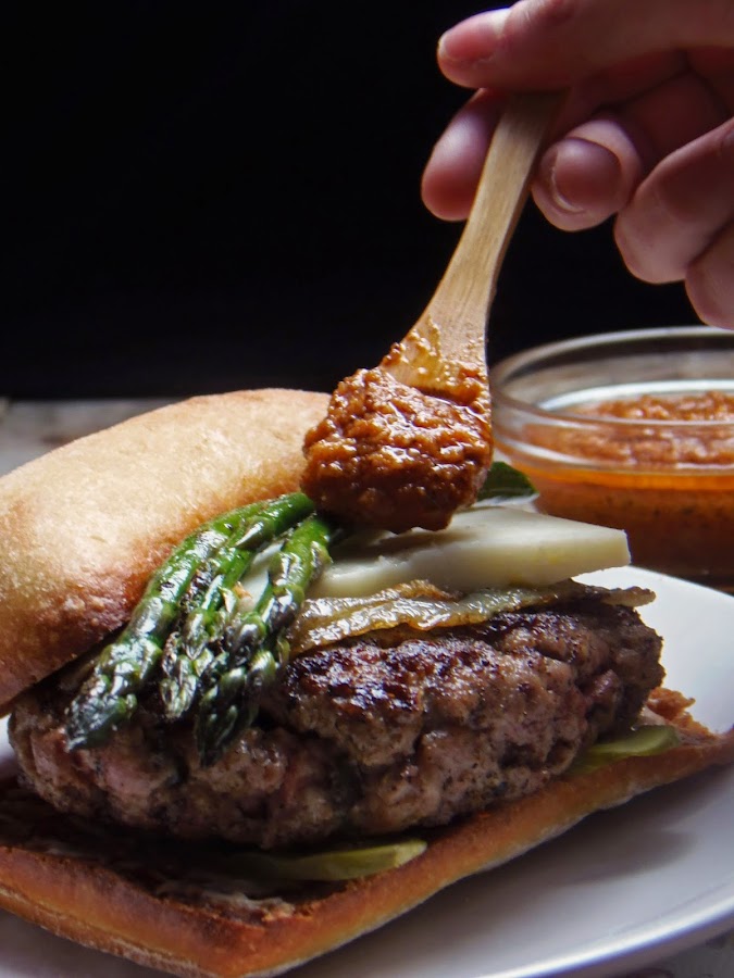 Me encanta la salsa romescu, todos los ingredientes me parecen fantásticos y al ir casi todos elaborados al horno le dan un toque a la salsa muy especial. Normalmente la hago para acompañar puerros, o esparragos verdes y en una de esas comidas se nos ocurrió que podía quedar bien como salsa de hamburguesas, asi que dicho y hecho, preparé unos bocata-burguer (no tenía pan de hamburguesas y use chapatitas) que os aseguro que ya forman parte de nuestro particular recetario.