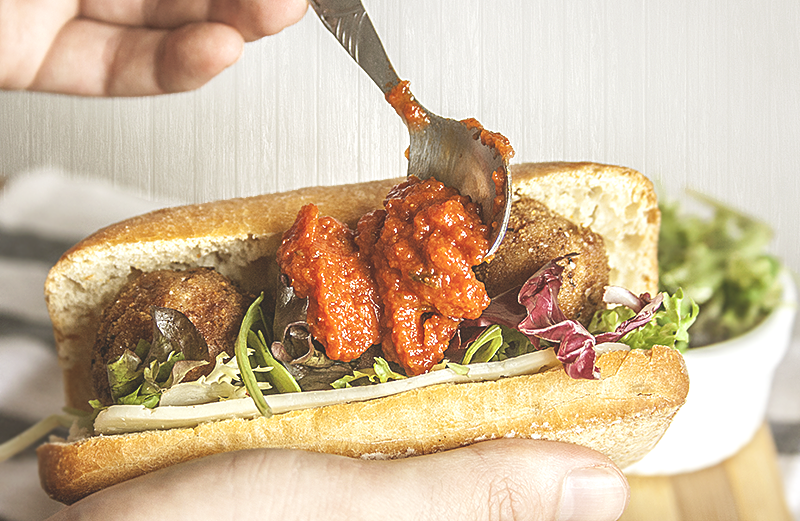 Montamos el bocata abriendo las minichapatas y poniendo queso Havarti cremoso de Arla, los brotes de lechuga, las albóndigas y un poco de salsa de tomate.