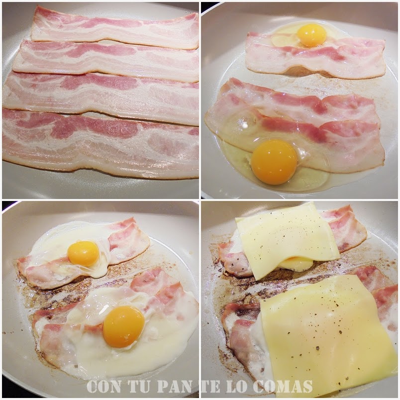 Me ha costado más tiempo hacer las fotos que el mismo bocata, así que te puedes imaginar que esto es visto y no visto. El bacon que lleva se hace sin aceite (así que ojo, sartén antiadherente), el huevo a la plancha encima del bacon, y terminamos con queso. ¿Cómo lo ves?