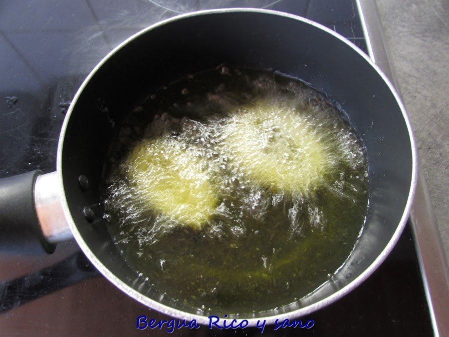 6. ¡Toca freír! Con suficiente aceite. Si tenéis una espumadera o una rasera grandes, mejor; podréis freír y sacar más cantidad de calamares a la vez. Yo mezclo aceite de oliva y de girasol; es más económico, el sabor es más suave, y además la temperatura se mantiene más estable.