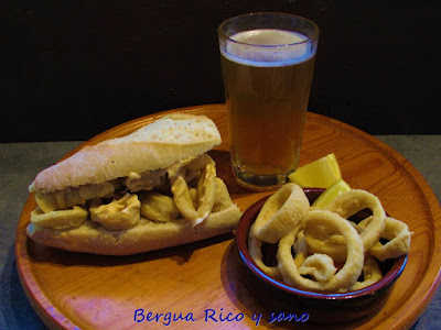 8. El resto es "pan comido" ;) Metemos una ración generosa de calamares en el pan y coronamos con la salsa. Listo. Y lo típico es acompañar con una cerveza.