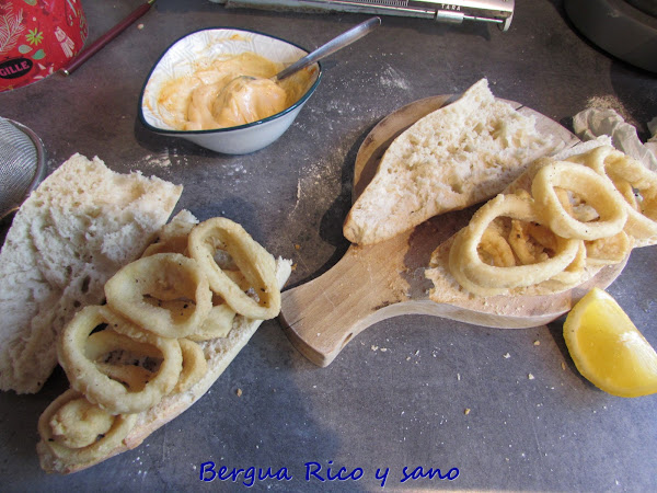 Como siempre, lo primero fue investigar. Me sorprendió descubrir las diferencias regionales que existen a lo largo de España, en una receta que parece tan clara y sencilla. Estos que he hecho yo, son los únicos que he visto en bocadillo/bocata y los que se sirven en bares, restaurantes y chiringuitos de La Costa Blanca y el interior colindante. Se hacen con harina y poco más, es un rebozados la ligero, con un toque crujiente que contrasta con el calamar tierno. Al parecer, con este tipo de rebozado se conoce en otras zonas como "calamares a la andaluza". Pero esta es la receta clásica y se conocen como "calamares a la romana". También se usa este rebozado para chipirones y pescaítos. La otra variante es un rebozado con huevo y leche, que recuerda al de las gambas en gabardina. Ese rebozado es acolchado y se desprende de la anilla de calamar por dentro.
