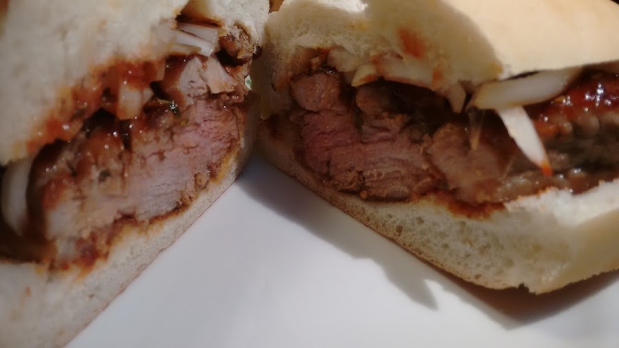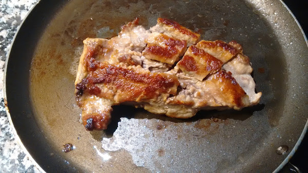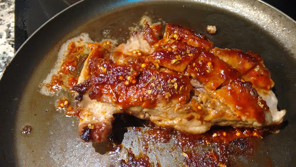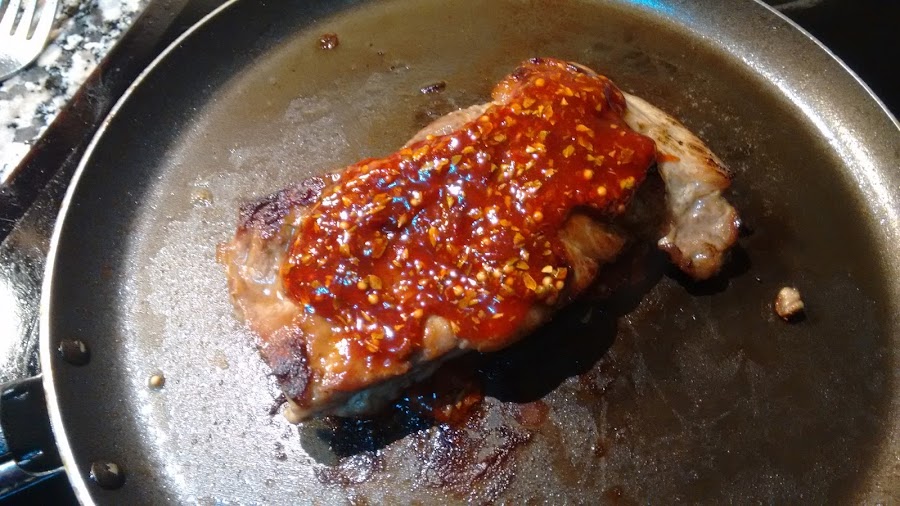 Ponemos salsa bbq encima, dejamos unos minutos, damos la vuelta y ponemos salsa bbq. Esto lo repetimos dos veces, siempre a fuego medio bajo para que el churrasco se haga por dentro.