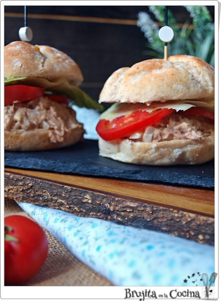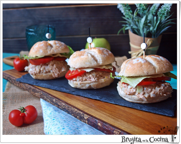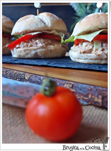 Cogemos el pan y untamos la base generosamente con la ensalada de atún, después cubrimos con unas rodajas de tomate y hojas de lechuga.