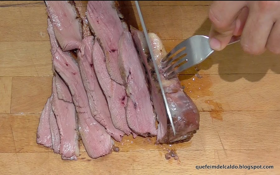 Sobre la mostaza colocamos 3 ó 4 lonchas de magret de pato.