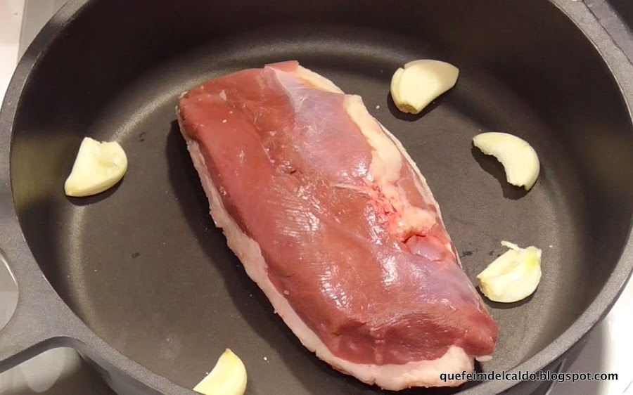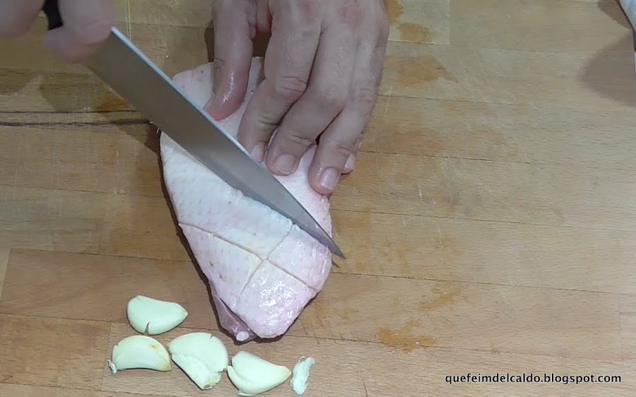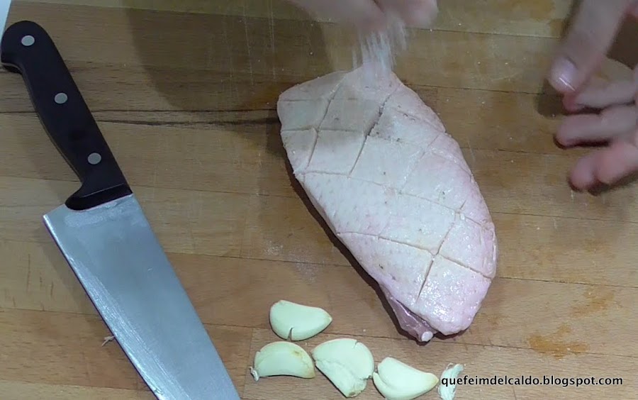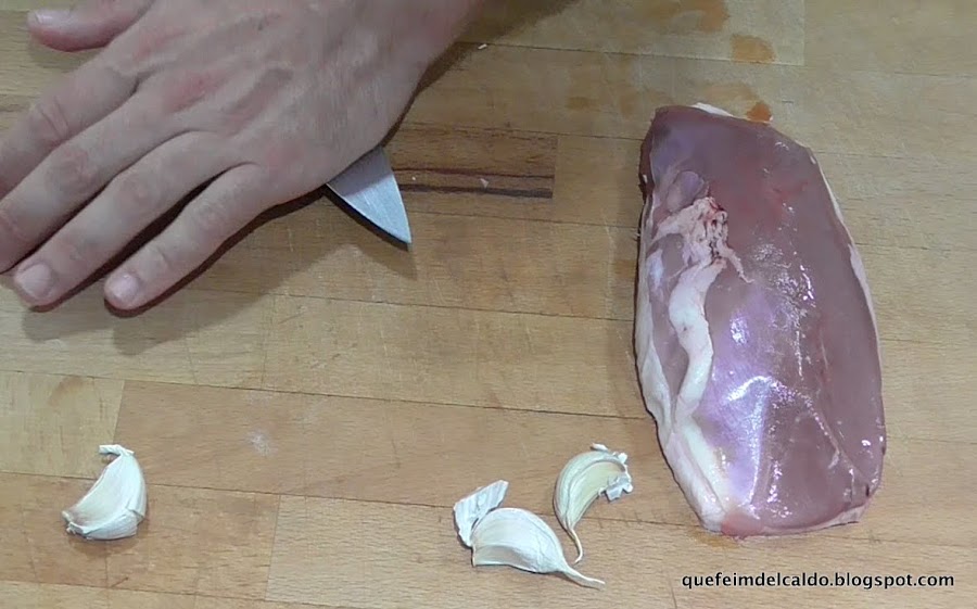 Nos disponemos a preparar el magret de pato, para ello machacamos 4 dientes de ajo para retirarles la piel.