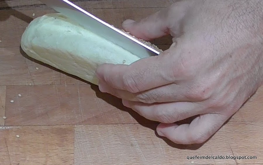 Y ahora empezamos a montar nuestro bocata, para ello cortamos un pan nuestro por la mitad.