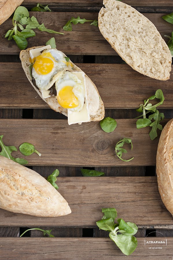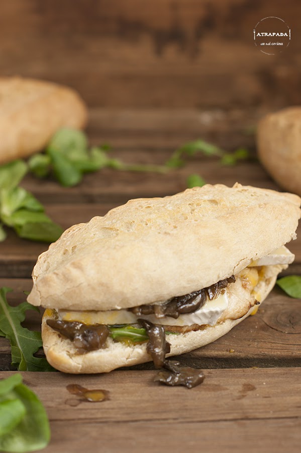 Preparamos entonces el bocata, abrimos por la mitad ponemos un poco de rúcula y canónigos, el pollo que habremos asado en una plancha, vuelta y vuelta para que quede más jugoso y no quede seco, añadimos una cucharada de setas al P.X. y terminamos con dos huevos de codorniz que habremos hecho en una sartén con un poco de aceite. Tapamos con la otra parte del panecillo y empezamos a disfrutar.