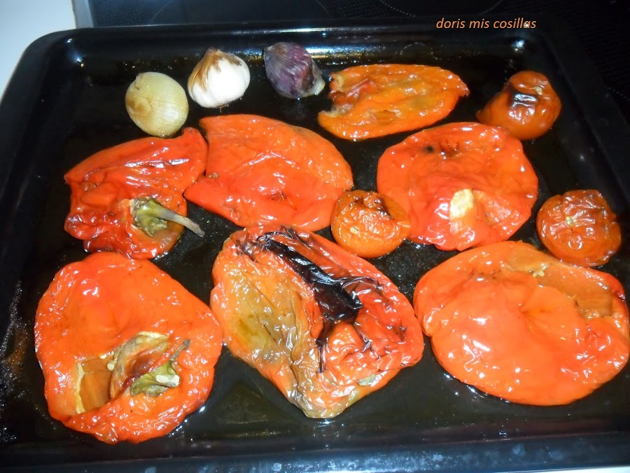Para la bandeja de verduras asadas: 1 Cabeza de ajo, pimientos tomates y cebolla y un chorito de aceite.