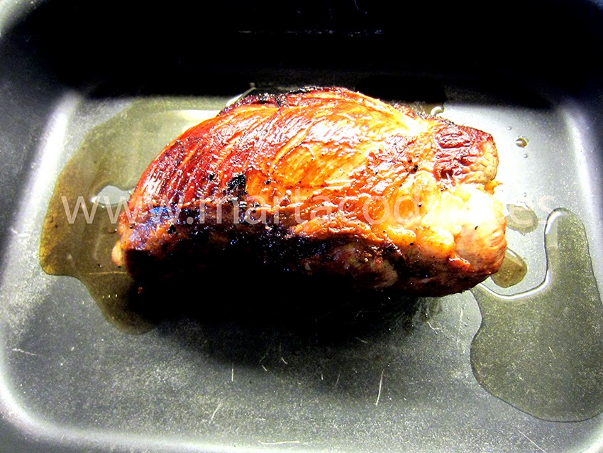 Freír en redondo para sellar las paredes. Poner en una bandeja para horno con dos cucharadas de aceite de oliva limpio. Introducir en el horno unos 30 minutos, 15 minutos cada cara.