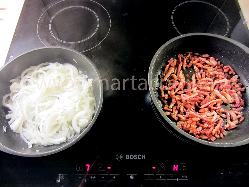 Pelar y cortar la cebolla en juliana y caramelizar con un poco de Brandy. Freír el bacon para extraer el exceso de grasa.