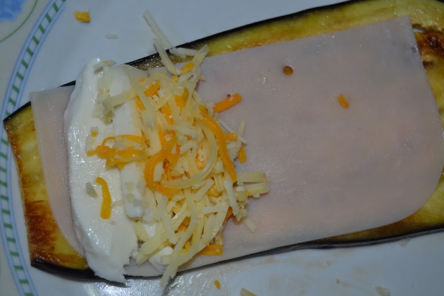 Ponemos una loncha de berenjena, un trozo de jamón york o pavo, encima un poco de queso mozzarella, otro poco de queso de cabra y otro poco de cuatro quesos.