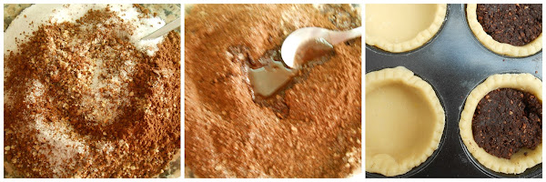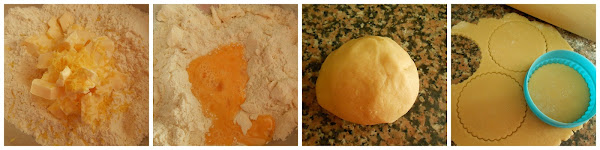 Ponemos en un bol la harina con el azúcar y agregamos la mantequilla fría troceada y la ralladura de limón. Deshacemos la mantequilla con la harina hasta obtener una textura arenosa. Agregamos el huevo batido y unimos hasta formar una masa uniforme, suave y que no se pega a los dedos. Si es necesario le añadimos el agua, poco a poco para no pasarnos. Vuelco al masa en el encimera (mesada) enharinada y estiramos con rodillo hasta dejarla de 5 mm. de espesor. Cortamos círculos de 10 cm. de diámetro, los colocamos en el molde de cupcakes y llevamos a la nevera durante 30 minutos.