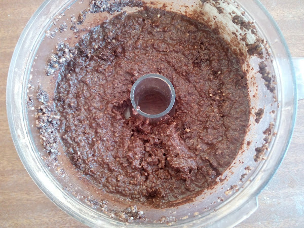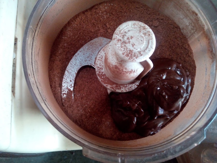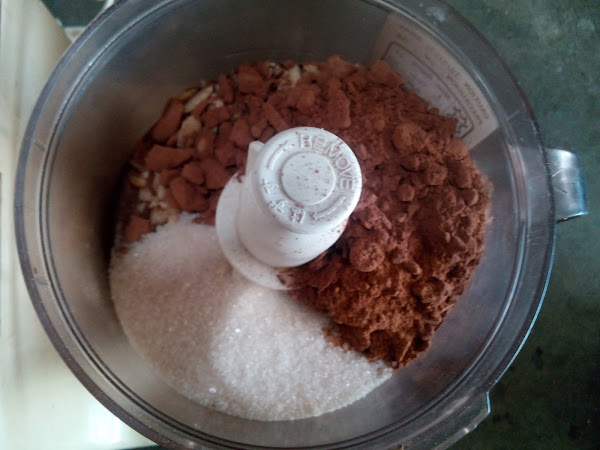 Mientras tanto preparamos el relleno. Colocamos en un procesador de alimentos las almendras con el azúcar, el cacao y la canela.