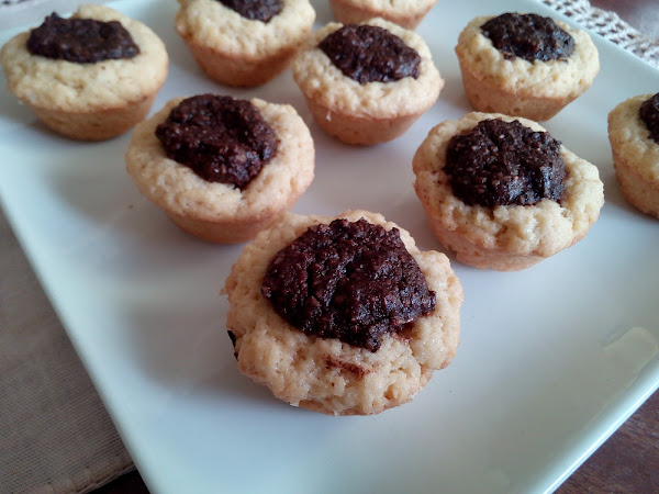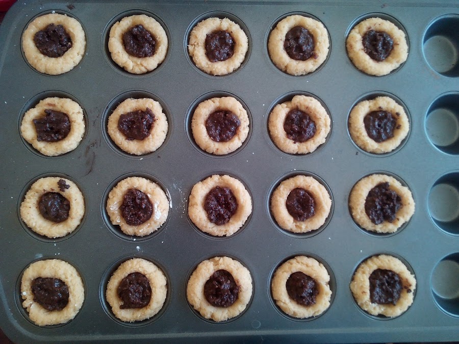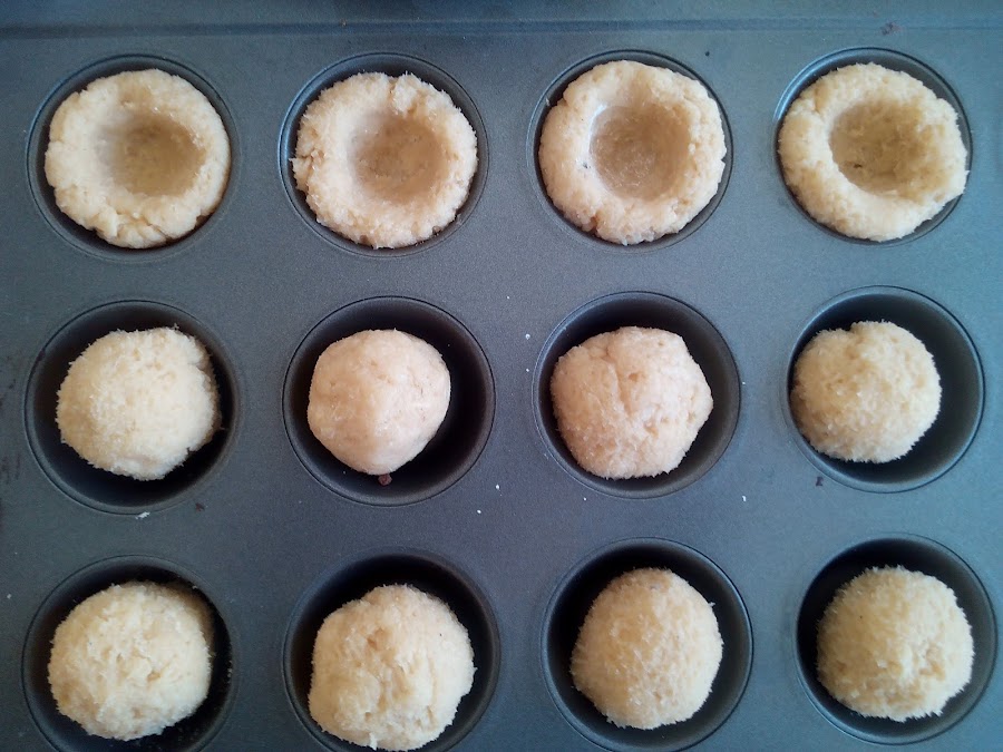 En los moldes engrasados para mini cupcakes, colocamos la masa en bolitas de una pulgada de diámetro aproximadamente, y con nuestros dedos presionamos el centro para hacer espacio para el relleno.