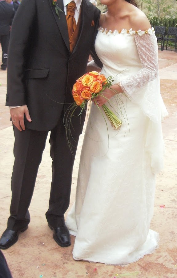 Una foto de los novios. El ramo en bouquet estaba compuesto por rosas naranjas y cola de oso.