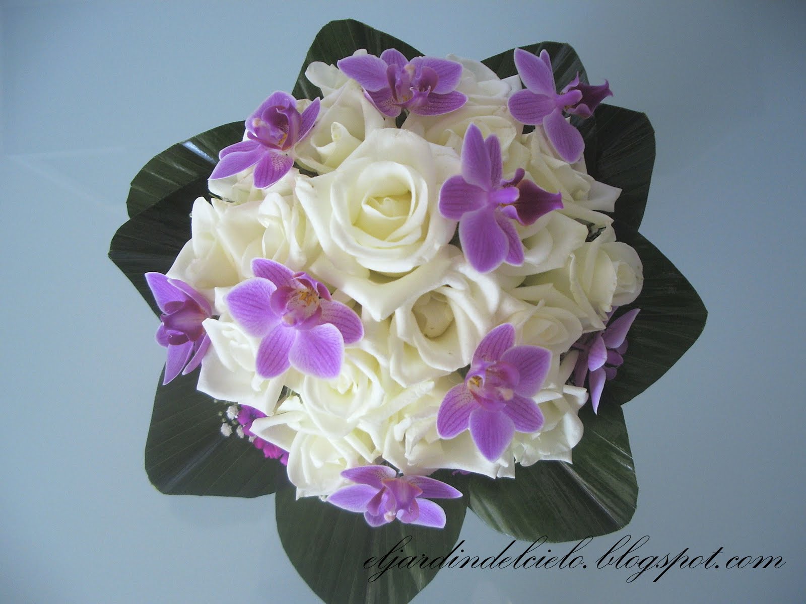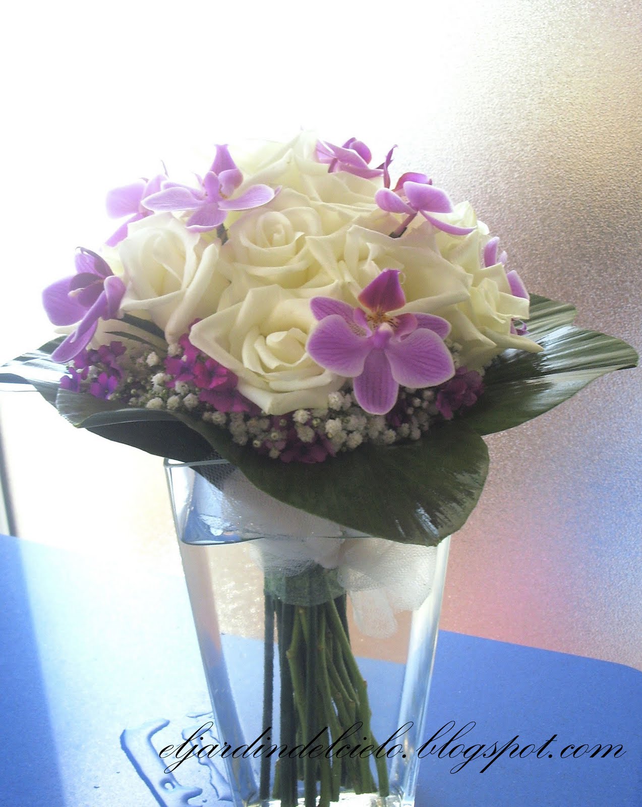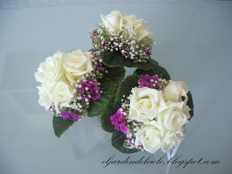 Este fin de semana he asistido a la emotiva boda de unos amigos amantes ellos de todo lo que tenga que ver con Andalucía, el Rocío y la virgen. He tenido el gusto de regalarles lo mejor de mi casa, las flores y aquí os las pongo para que disfruteis de ellas tanto como yo en prepararselas. El ramo de la novia con rosas blancas y orquídeas enanas en color malva llevaba alrededor una corona de paniculata y verbena lila que le daba un aire muy romántico.