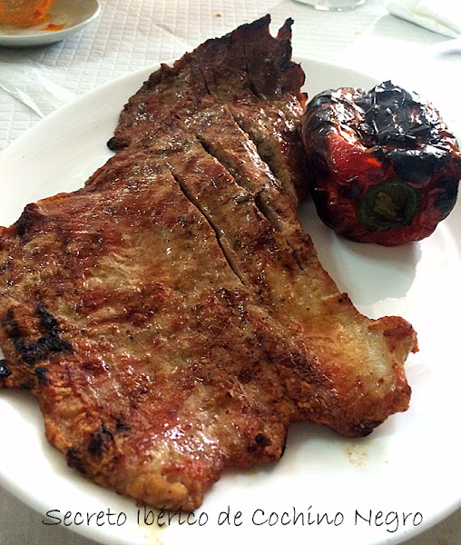 De segundo, o principal, nos ofrece Conejo en Salmorejo (lo probé y está muy bien, muy casero), Carne de Cabra (algo que dejé pendiente para una próxima y segura ocasión), Pollo asado a la piedra y Secreto Ibérico de Cochino Negro (de cerdo negro, para los de fuera) también asado a la piedra.