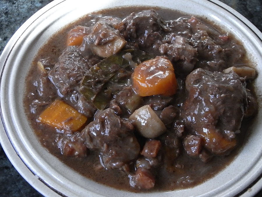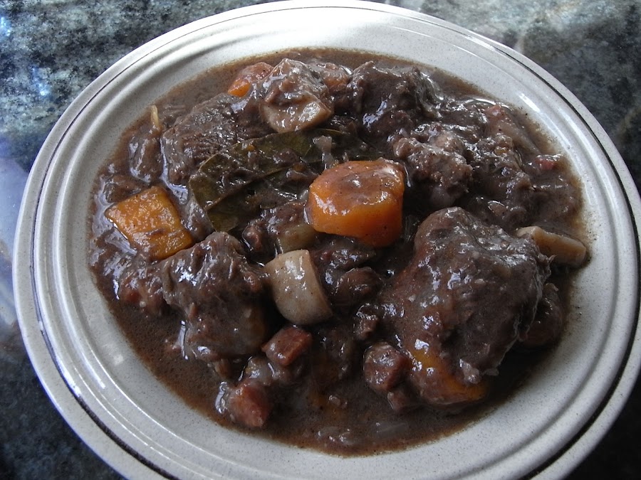 Esta receta es de un plato típicamente francés, de la región de Borgoña, principalmente lleva mucho vino tinto (cuanto mejor sea el vino, mejor estará la salsa), panceta salada y champiñones.