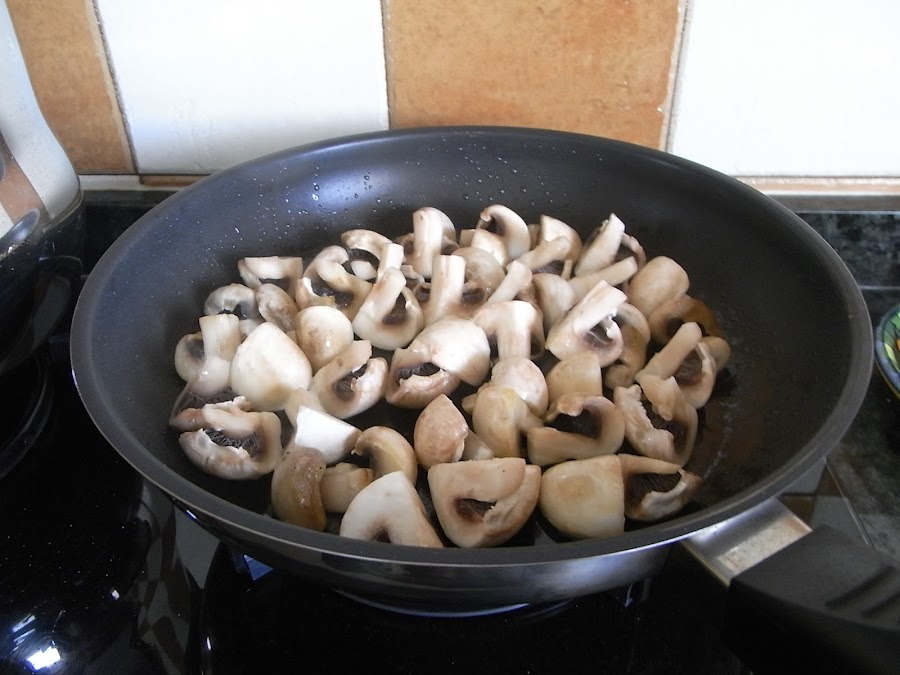 Mientras lavé, troceé los champiñones en cuartos y los salteé en una sartén con un chorrito de aceite de oliva para añadirlos a última hora.
