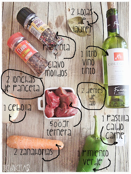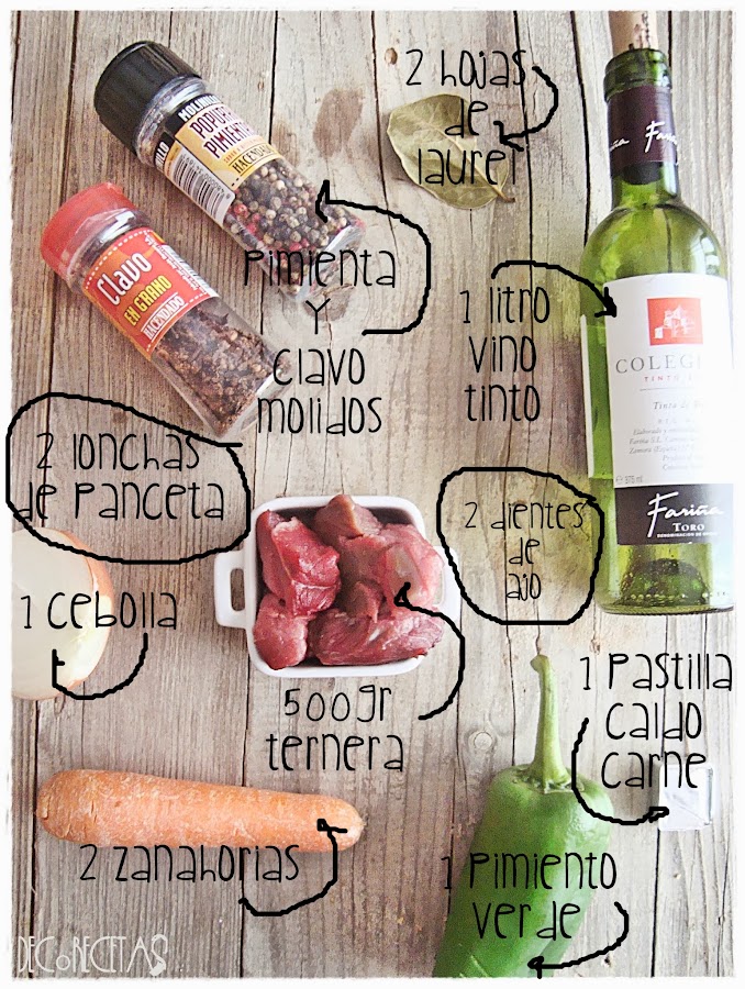 La noche anterior a cocinarlo, cortamos bien picaditoas las verduras: la cebolla, zanahorias, ajos, laurel y pimiento. Lo metemos en un bol junto con la ternera salpimentada y el clavo. cubrimos con el vino tinto y dejamos macerar.