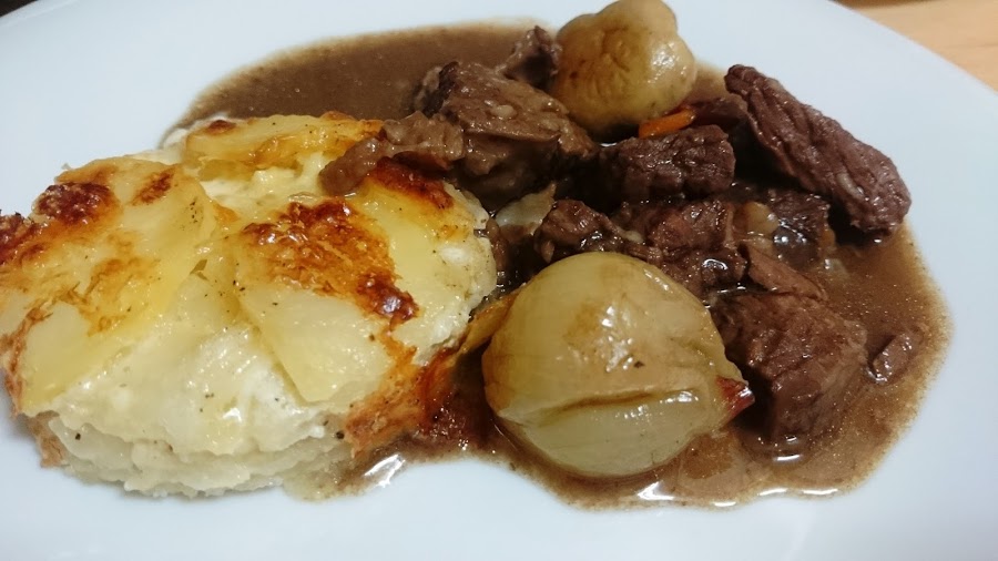 Calentamos el horno a 160º. Sacamos la carne del bol reservando el vino y el ramillete de hierbas. Secamos la carne con ayuda de papel de cocina. Ponemos a calentar 30 grs de mantequilla en una sartén. Añadimos la cebolla, la zanahoria y el ramillete de hierbas y freímos a baja temperatura, removiendo constantemente durante 10 minutos. Retiramos del fuego y reservamos.