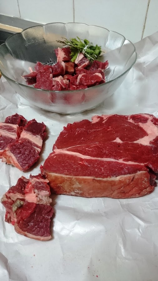 Cortamos la carne en cubos de unos 4 cm y quitamos el exceso de grasa. Ponemos la carne, el vino, el ajo