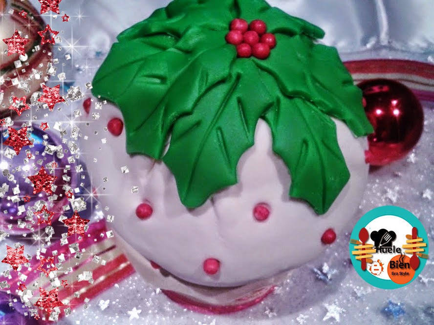 Mini tarta bola de Navidad, hecha con bizcocho con sabor a almendras, rellena de bolas de caramelo y cubierta con pasta fondant.