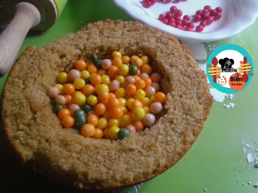 3.- Vertemos la masa en los moldes. Cocinamos con el horno precalentado a 180ºC, unos 30 o 35 minutos. Dejamos enfriar y desmoldamos los bizcochos. Cortamos la superficie. hacemos un hueco en una de ellas, quitando parte del bizcocho. Rellenamos el hueco con los caramelos. Unimos las dos mitades formando una bola.