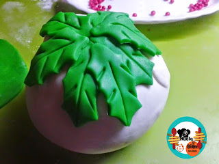 Estiramos también la pasta verde, la cortamos con los moldes para hacer las hojas de flores de pascua. Decoramos con ella la bola, cubriendo las imperfecciones que son visibles.