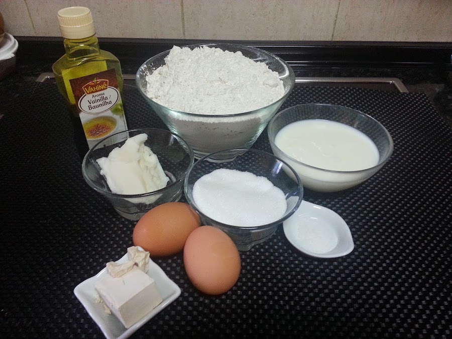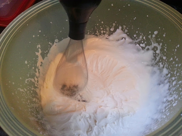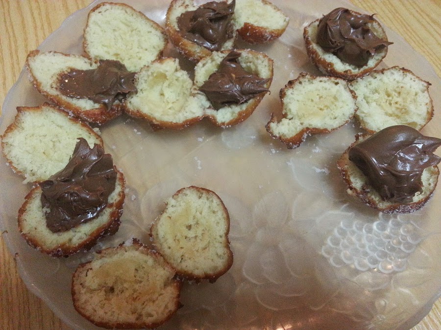 En nuestro caso, hemos rellenado de nata (crema de leche) y crema de chocolate (nocilla, nutella o silmilar). Mientras reposan las bolas, preparamos la nata (crema de leche).