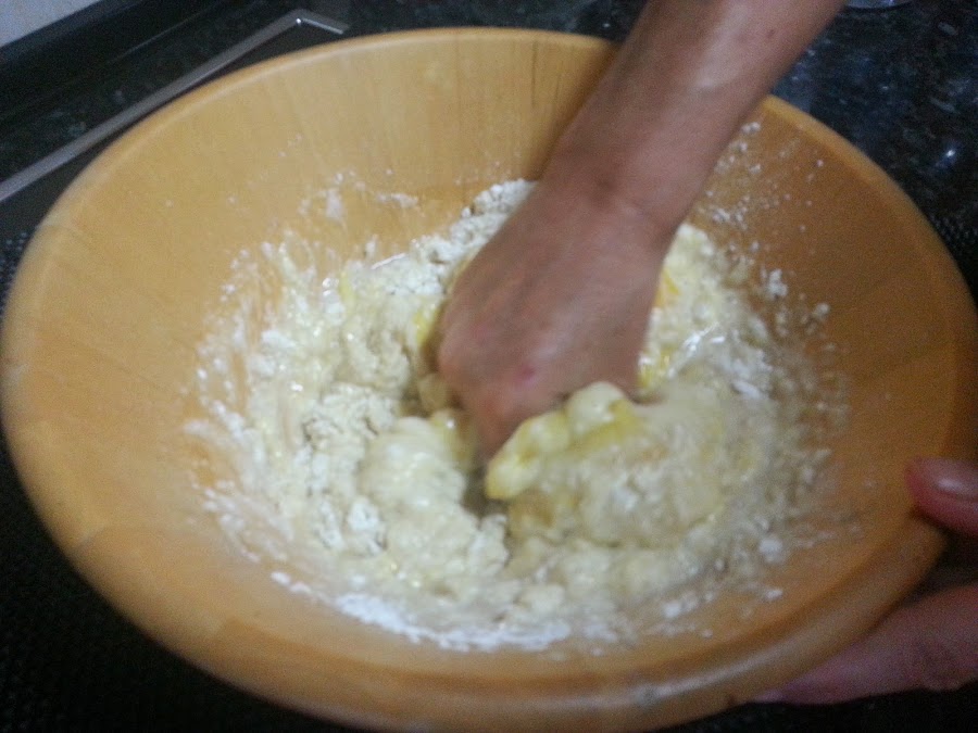 Pasado este tiempo, hacemos bolas con la masa y las colocamos sobre una superficie lisa. Es muy conveniente disponer de un recipiente con agua para ir mojándonos las manos para que no se nos pegue la masa.