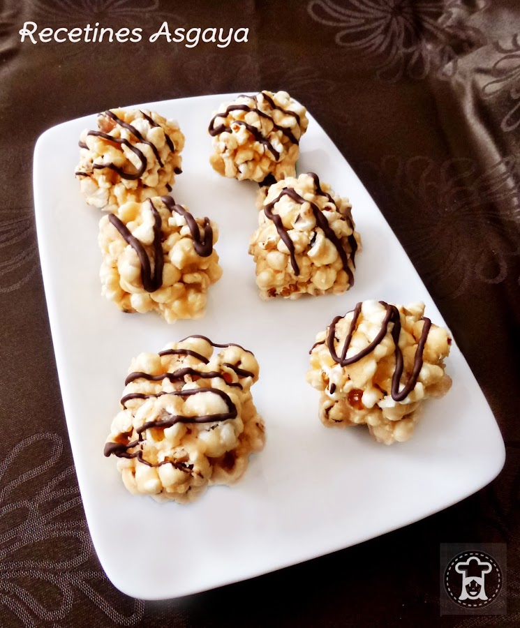 Verter el caramelo sobre las palomitas y remover con ayuda de un par de cucharas de metal untadas con aceite de oliva. Cuando la mezcla empiece a enfriarse lo suficiente para manipularlo sin que llegue a solidificarse, tomar porciones con las manos untadas en aceite y hacer bolas del tamaño de una pelota de golf. Disponer sobre una rejilla y dejar enfriar. Fundir el chocolate en el microondas, y con una manga pastelera, adornar a nuestro gusto.