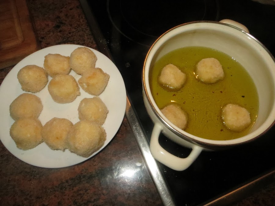 Una vez lo sacáis de la nevera hacéis bolitas y las vais rebozando, primero las pasáis por harina, luego por huevo y finalmente por pan rallado. Una vez tenéis todas las bolas rebozadas, ponéis aceite a calentar y las freís. Escurrís en un papel y listas para servir, las podéis acompañar con la salsa que más os guste.