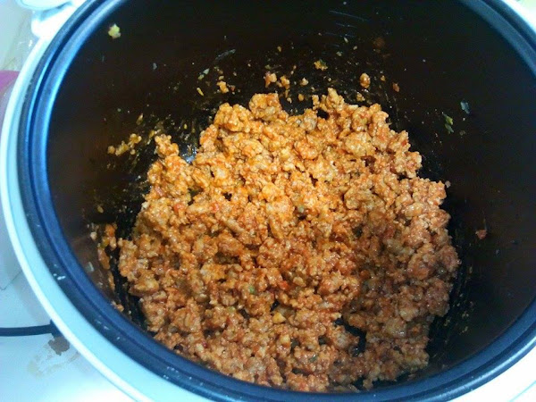 4- ponemos 2 cucharadas de aceite en la cubeta y programamos menú plancha unos 20 minutos. Añadimos la cebolla y el ajo y vamos pochando. Cuando queden 10 minutos añadimos la carne y rehogamos. Cuando esté cocinada añadimos tomate frito, cantidad al gusto. Reservamos la carne