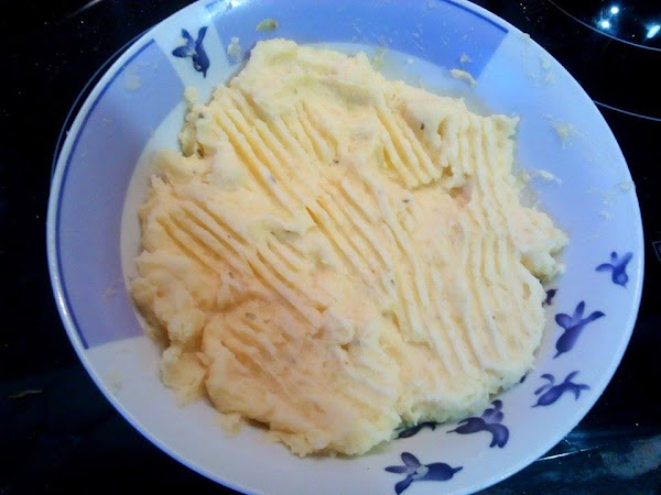 5- pelamos las patatas y las machacamos con un tenedor o pasamos por pasapure. Ponemos sal al gusto y si deseamos un poco de orégano. Hacemos como una pasta de patata. Si se quiere se puede añadir también un huevo batido. Dejamos enfriar la pasta unos minutos en la nevera.
