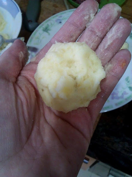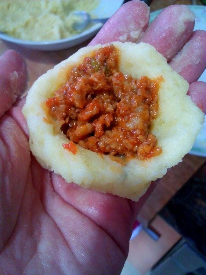 6- vamos cogiendo porciones de pasta de patata y hacemos una bola del tamaño q deseemos (en mi caso quedaron del tamaño de una pelota de ping pong). Hacemos un agujero con los dedos en la bola e introducimos carne picada y si se desea unos trozos de queso. Cerramos bien la bola asegurándonos que queda sellada por todas partes. Hacemos lo mismo cin toda la patata y la carne.