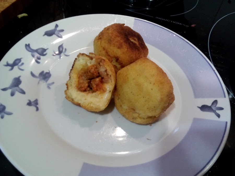 7- pasamos las bolas por huevo batido y pan rallado y freimos en aceite bien caliente. En mi caso probé a freírlo el robot pero Mo cogía excesivo calor y no se doraban. Así q lo frei en una sartén. Pero se puede hacer en el robot también. Es una receta bastante laboriosa pero queda muy rica