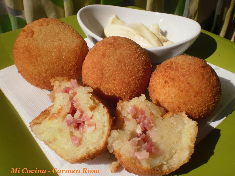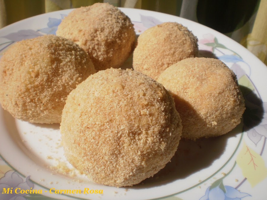 Coger una porción del puré, redondearlo y hacer un hueco introduciendo el jamón, cerrando nuevamente la bola, pasándola a continuación por huevo batido y posteriormente por pan rallado.