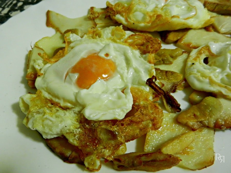 Cascamos los huevos en la plancha y dejamos hacer hasta que vemos la clara cuajada. Salamos. (Yo prefiero los huevos fritos y si es con puntilla, mejor, jeje)