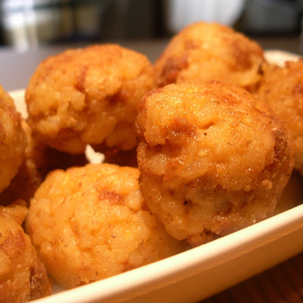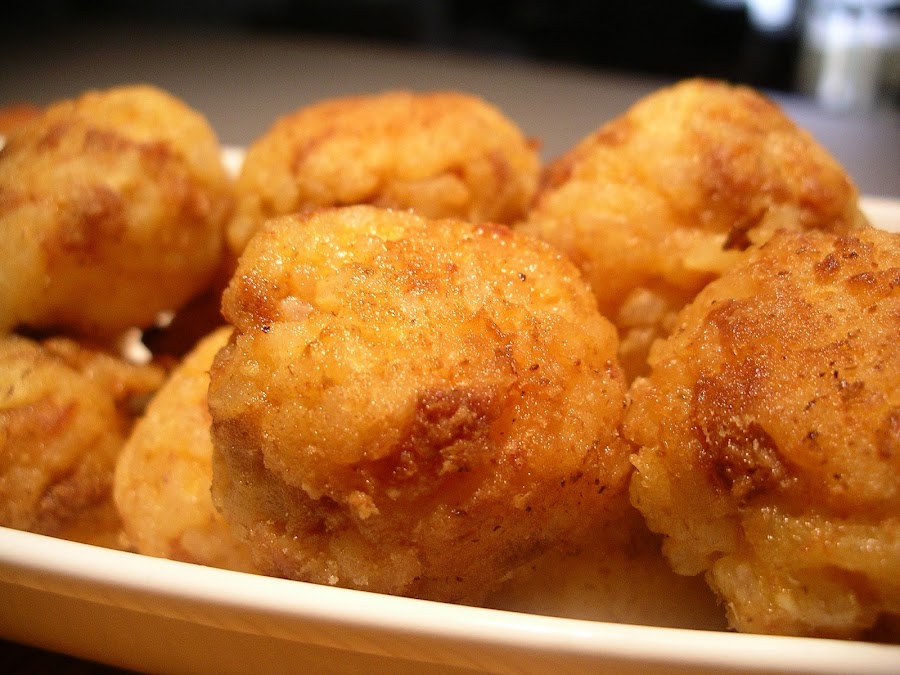 Finalmente hacer las bolas, pasar por harina, sacudir bien para quitar el exceso de harina y freír en aceite abundante. Listo el aperitivo, riquisimo!!!!