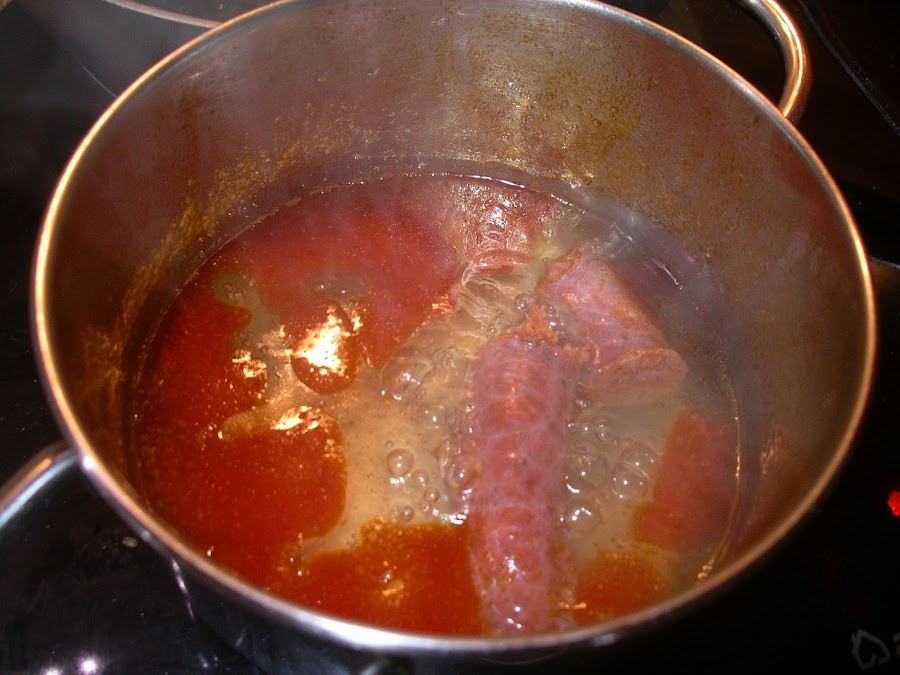 En primer lugar, en una cazuela ponemos el agua junto con el chorizo y cocemos durante al menos 15 minutos para que saque el jugo y el chorizo se ablande. Copio, como dice la receta original y aconsejo desgrasar el caldo. Para esto, debemos dejar que enfrié y poder retirar la grasa de la superficie. Después este caldo lo llevamos de nuevo al fuego con sal y cuando empiece a hervir ponemos el arroz. Cocer durante 20 minutos.