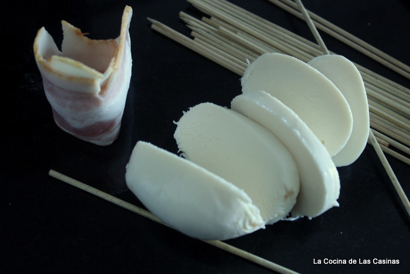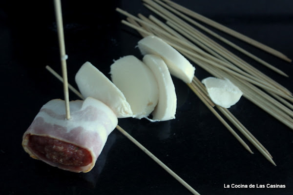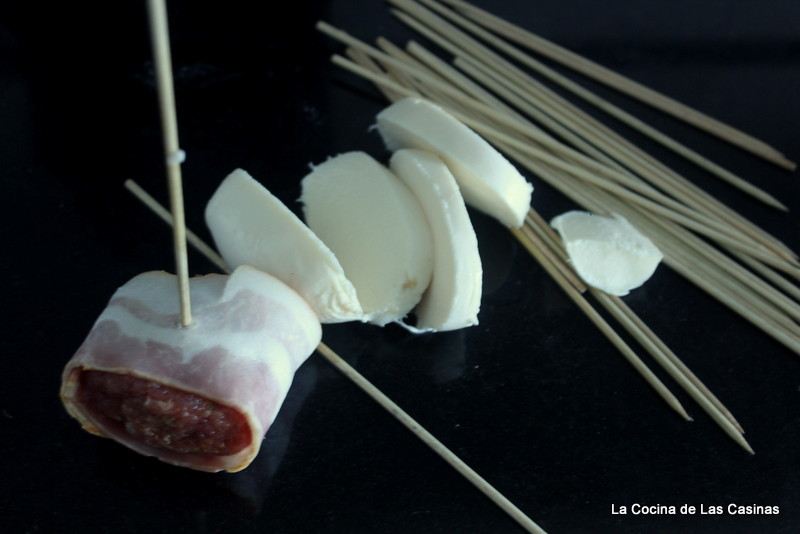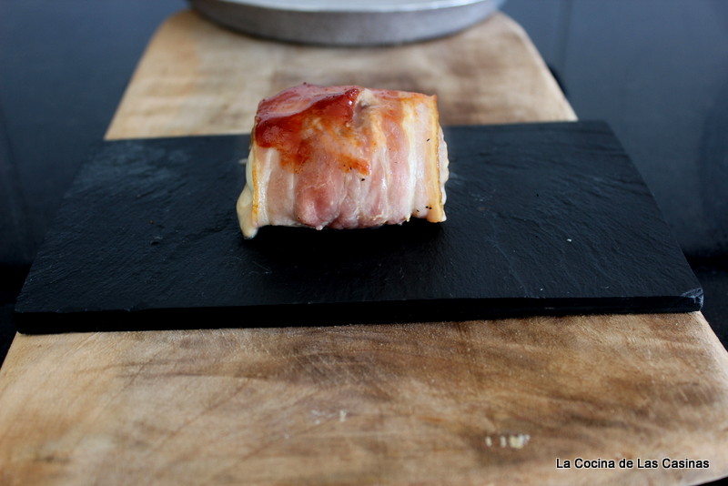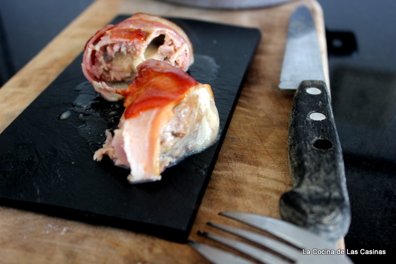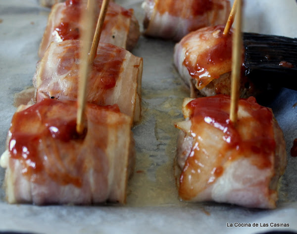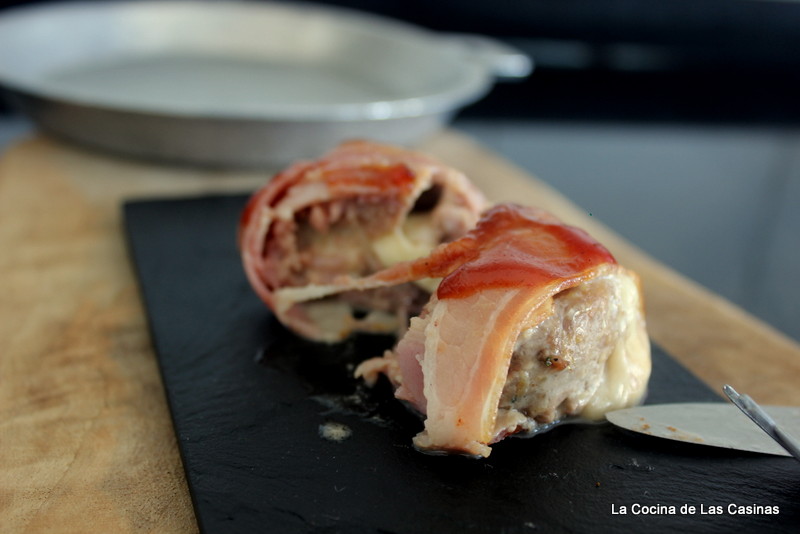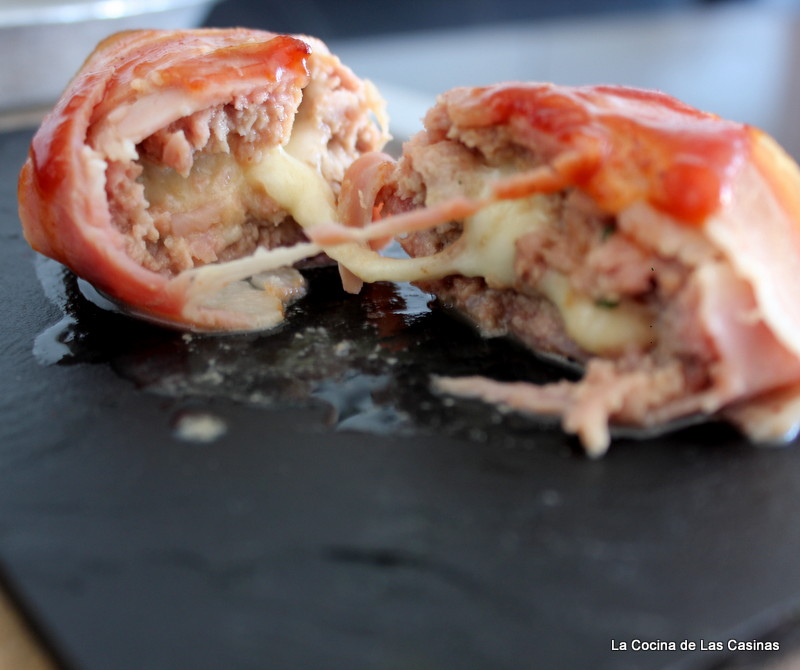 Divides la masa de carne en 8- 10 partes iguales. Extiendes cada una de ellas, en la palma de la mano formas un huequito donde incorporas el queso, formas una bola que aplastas, pintas con un poco de salsa barbacoa y envuelves en una loncha de bacon, la unión por abajo. Unes con los palos de brocheta humedecidos para que no se te quemen.