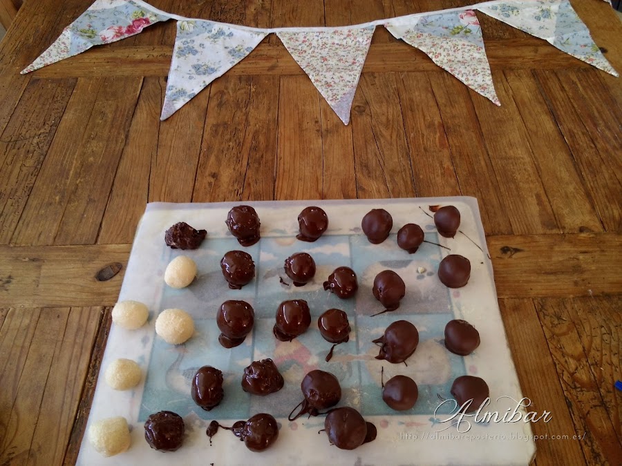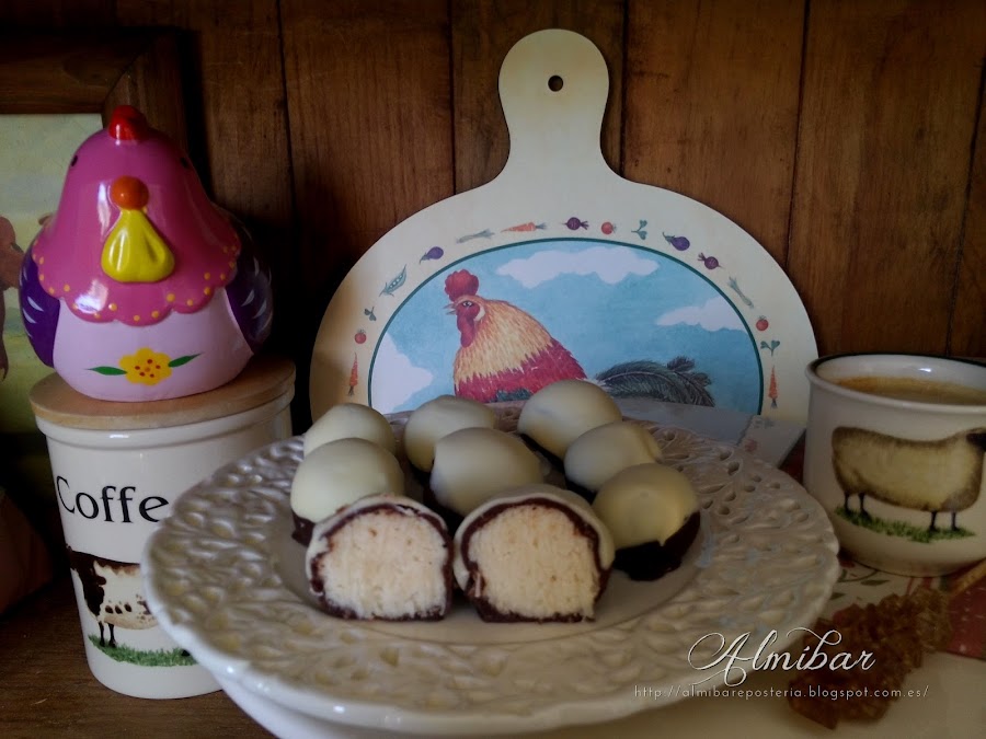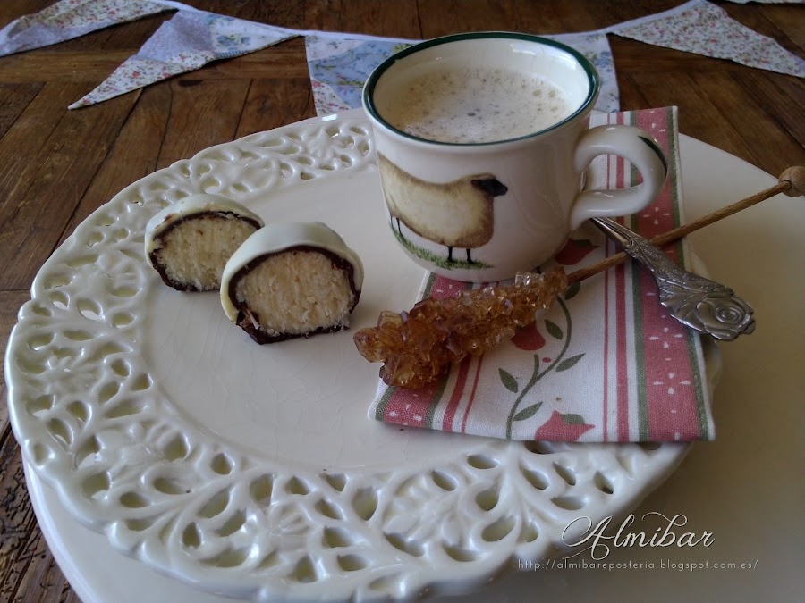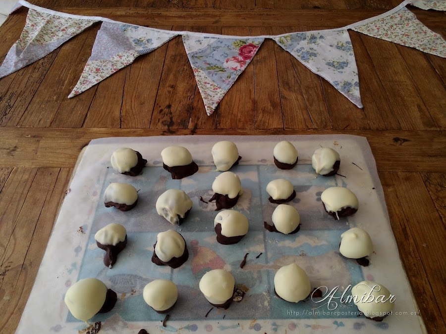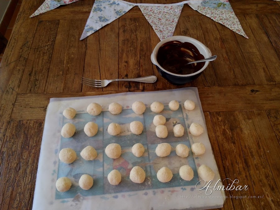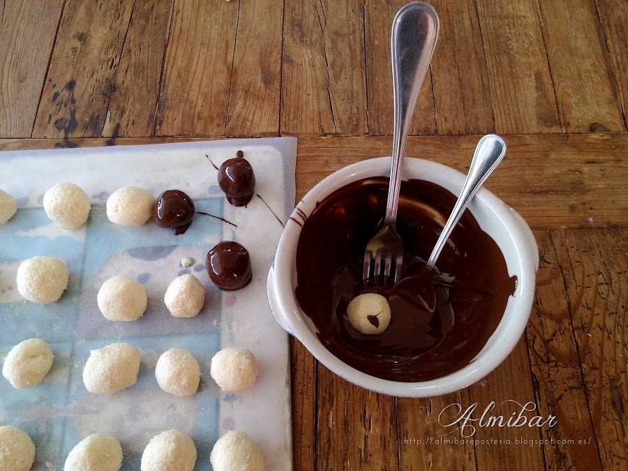...sacas las bolitas de coco de la nevera y las bañas parcialmente en chocolate blanco...