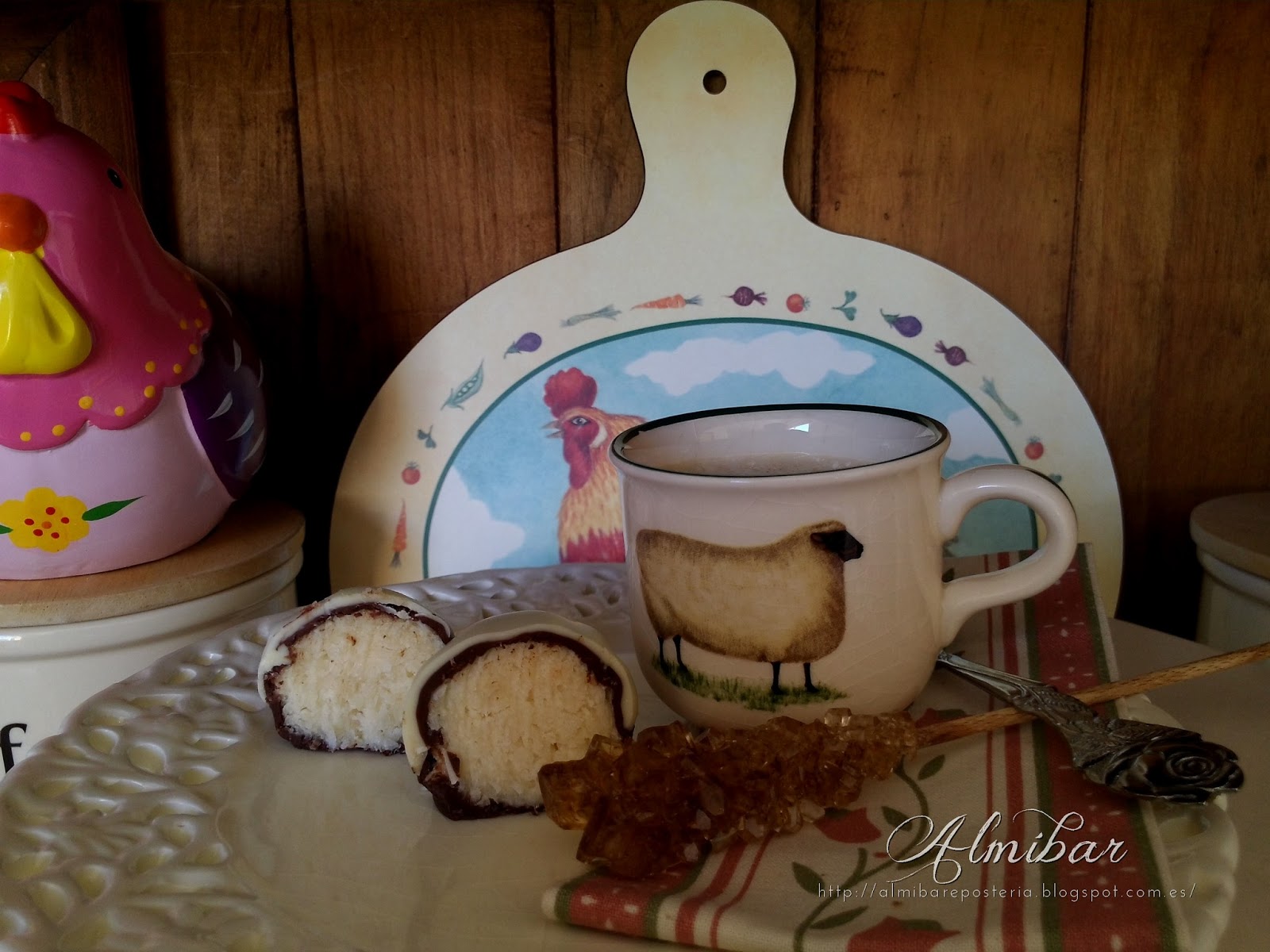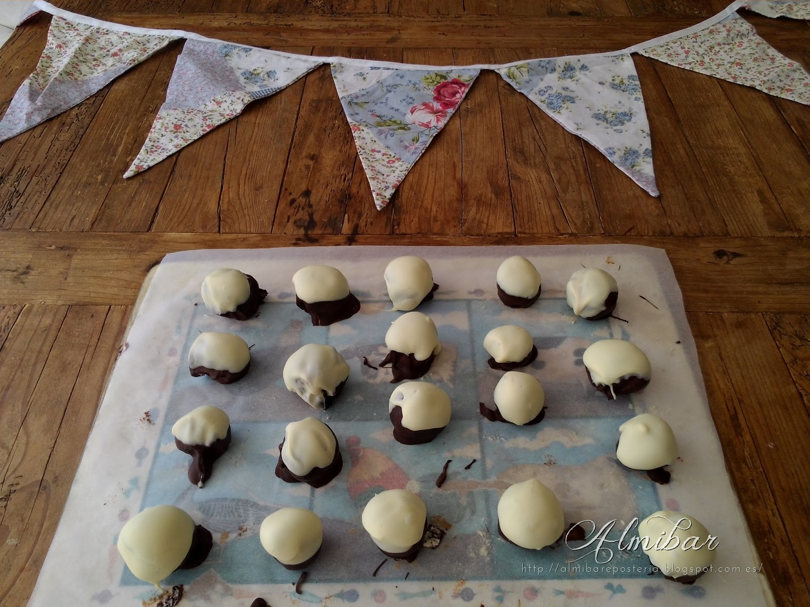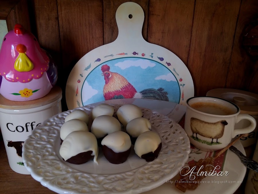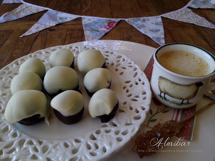 ...sacas las bolitas de coco de la nevera y las bañas parcialmente en chocolate blanco...