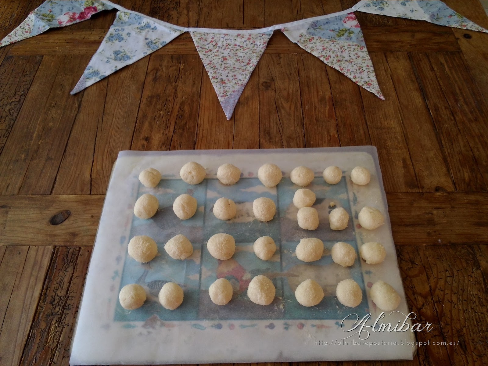 ...pones las bolitas de coco encima de una hoja de papel antiadherente...