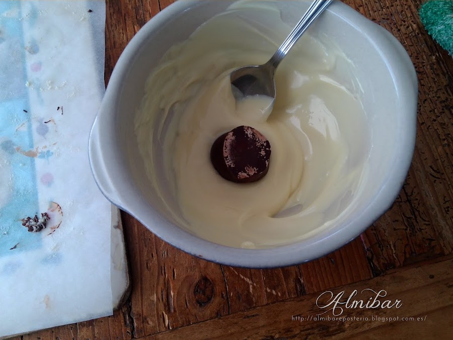 ...a continuación derrites el chocolate blanco en un bol cerámico, te enseño a fundirlo aquí...