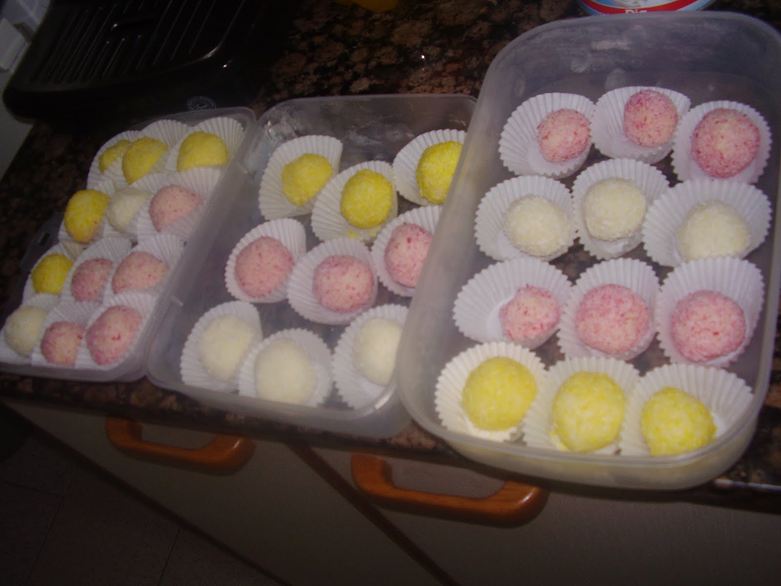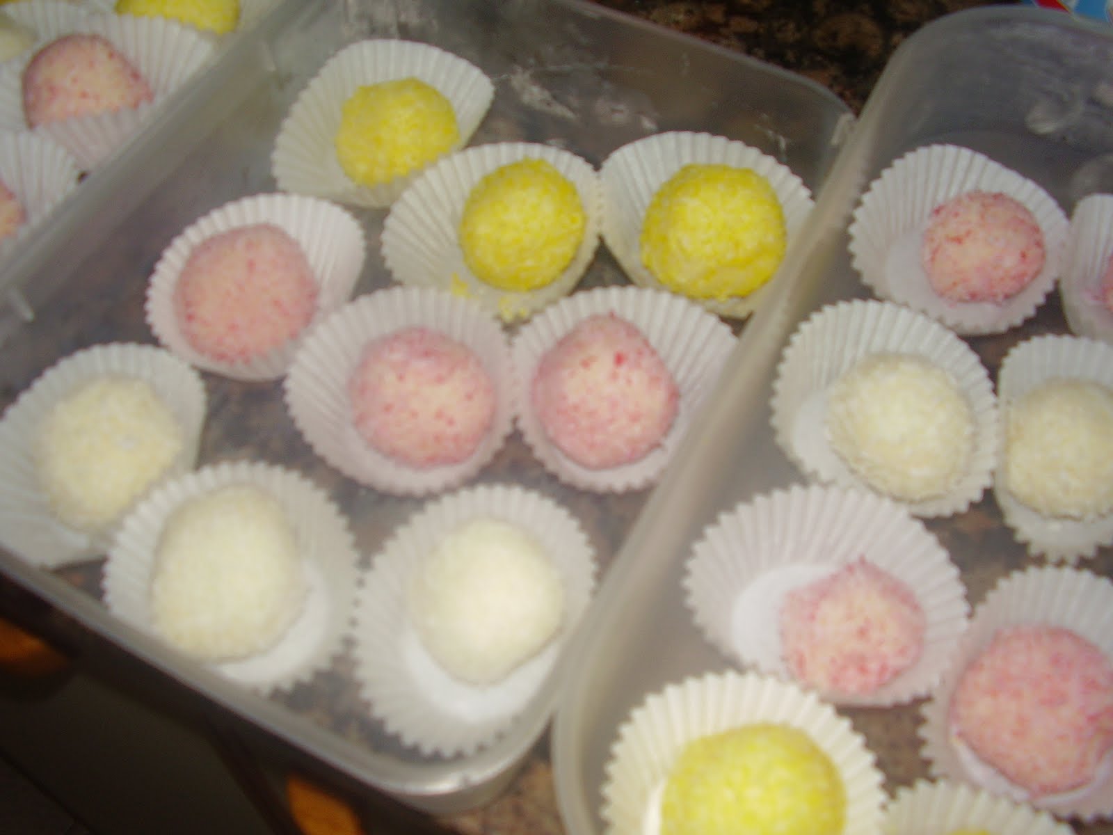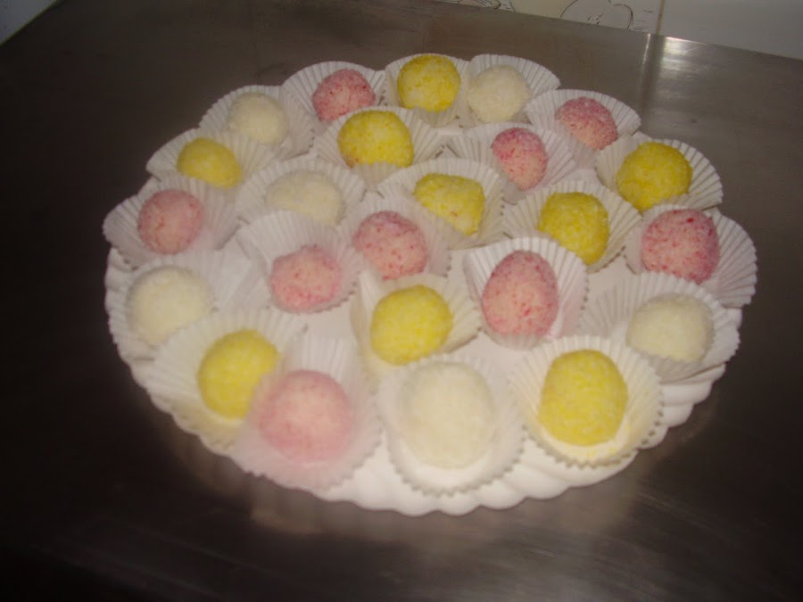 Mezclamos las 10 cucharadas de leche condensada con los 250 grs de coco rallado, y hacemos una pasta, que dejamos reposar una hora más o menos. Hacemos las bolitas y las rebozamos con el coco rallado, con los tintados como sin tintar. Las vamos poniendo en las cápsulas y metemos a la nevera.