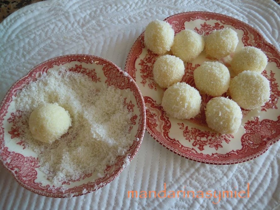 Mezcla el coco rallado con la leche condensada, reserva un poco de coco para rebozar las bolitas, guarda en la nevera la mezcla durante unas horas.