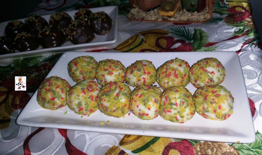 Mezclamos bien el coco rallado con la leche condensada y lo metemos un par de horas en la nevera, cuando tengamos una mezcla durita vamos haciendo las bolas y las pasamos por las virutas de colores y reservamos en un plato dentro de la nevera. Dejamos otras bolitas para poder bañarlas de chocolate.